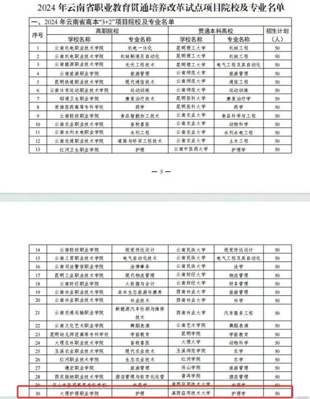 近日,云南省教育厅下发《关于启动实施2024年职业教育贯通培养改革试点工作的通知》,bat365中文官方网站被确定为云南省高本“3+2”职业教育贯通培养改革试点项目院校,学校优质护理专业与滇西应用技术大学优质护理学专业合作开展高本“3+2”贯通培养,2024年计划招生50人。