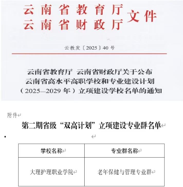 近日,云南省教育厅 、云南省财政厅联合印发《关于公布云南省高水平高职学校和专业建设计划(2025-2029年)立项建设学校名单的通知》(云教发〔2025〕40号),bat365老年保健与管理专业群确定为云南省第二期省级“双高计划”立项建设专业群。