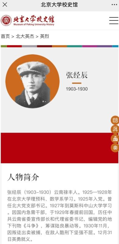 北京大学校史馆网站的张经辰烈士简介