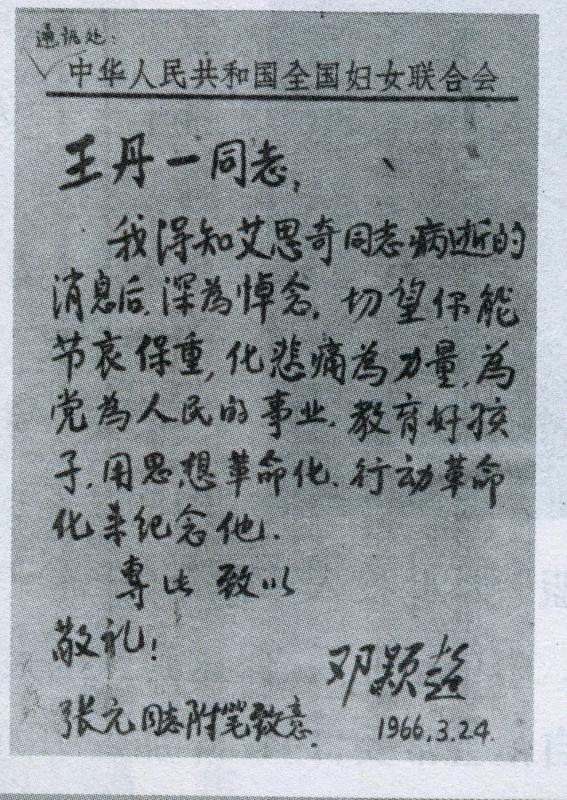 艾思奇去世后,邓颖超写给他的夫人王丹一的信