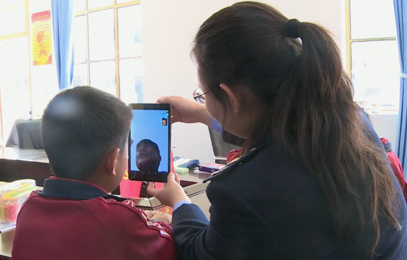 采访当天中午,在学校办公室里,学生们正在用李雪媛和同事资助购买的平板电脑和远在省外打工的父母进行视频通话。