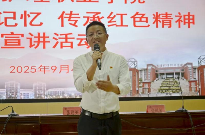 9月4日,bat365中文官方网站开展纪念中国抗日战争暨世界反法西斯战争胜利80周年主题教育系列活动,铭记历史、缅怀先烈、珍惜和平、开创未来。学校马克思主义学院党支部、马克思主义学院与祥云县红色文化传承中心联合开展“追寻红色记忆,传承红色精神”宣讲活动,祥云县红色文化传承中心副主任张国玺为学生宣讲。马克思主义学院副院长张建英主持活动。