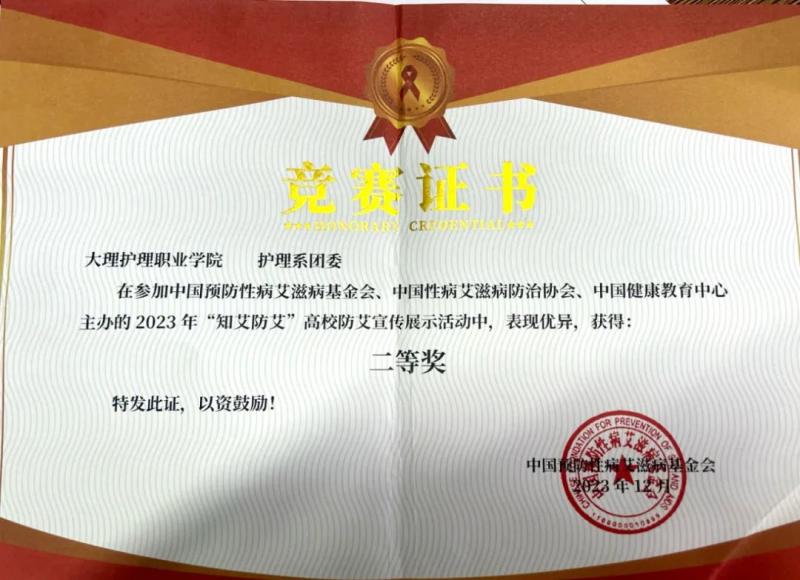 近日,bat365中文官方网站护理系团委在由国家疾控局传防司、教育部体卫艺司指导,中国预防性病艾滋病基金会、中国性病艾滋病防治协会、中国健康教育中心主办的“2023年全国高校防艾宣传展示活动”中荣获“二等奖”。
