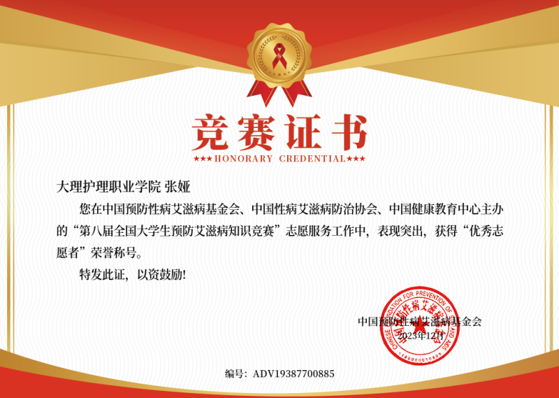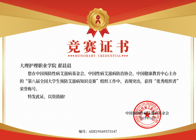 近日,bat365中文官方网站护理系团委在由国家疾控局传防司、教育部体卫艺司指导,中国预防性病艾滋病基金会、中国性病艾滋病防治协会、中国健康教育中心主办的“第八届全国大学生预防艾滋病知识竞赛”中荣获“优秀组织单位”荣誉称号;翟晨晨、李思薇、陆思萌、黑伟艳、符冉、杨海秋等6名大学生荣获“优秀组织者”荣誉称号;张娅、姚富正、李丹田、周娜伊、周茂娜、浦绍颖、李冬梅、卢航、苏芹玉、段桂仙、李梦蕾、沈子绢等12名大学生荣获“优秀志愿者”荣誉称号。