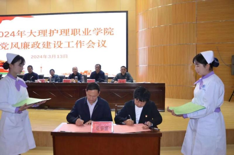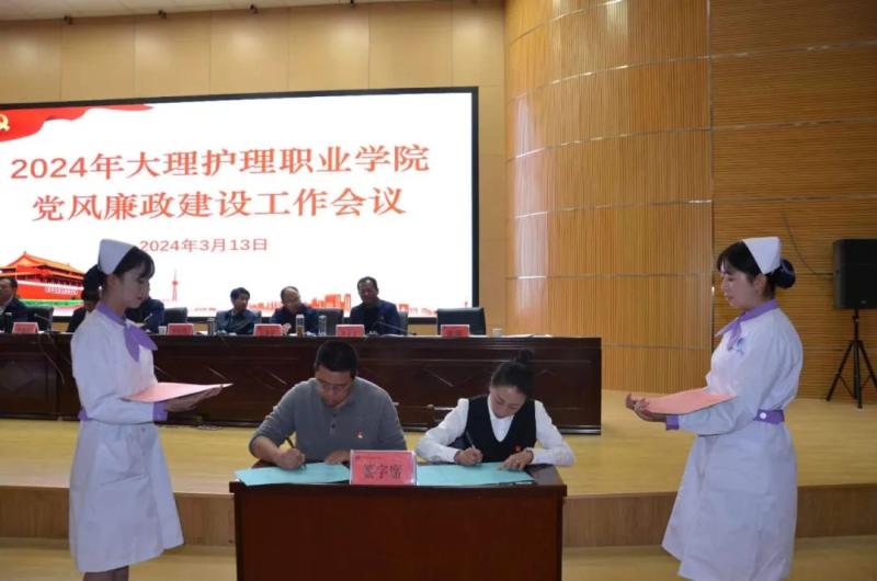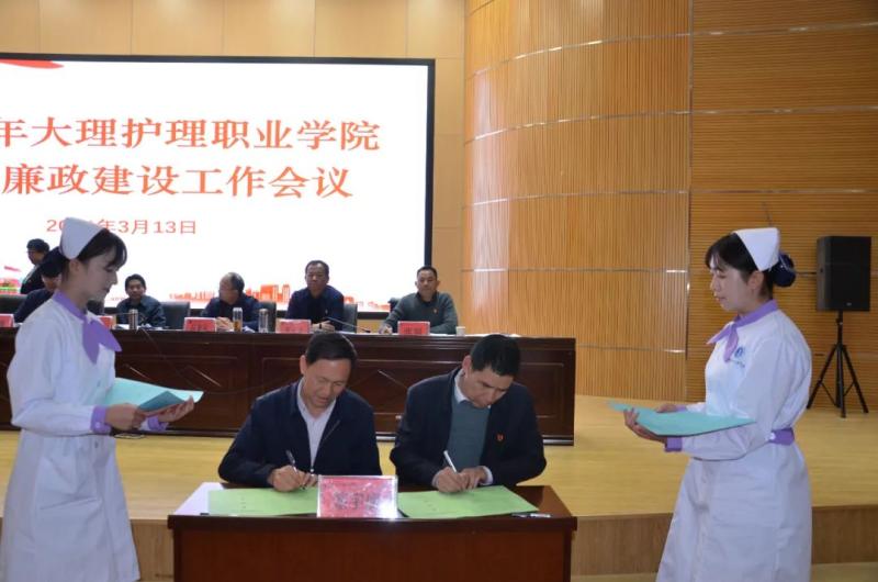 会上,校党委书记廖惠群同志和校党委专职副书记字利鹏同志签订了党风廉政建设责任书。校党委专职副书记字利鹏、副院长李洁根据工作分工分别与护理系党支部书记、门诊部主任签订了党风廉政建设责任书。