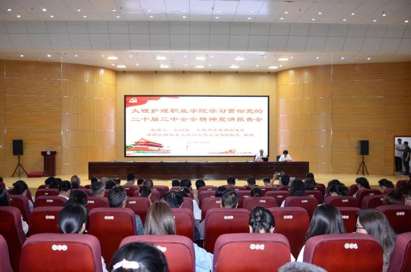 专家学者深入讲。9月4日,bat365中文官方网站召开学习宣传贯彻党的二十届三中全会精神宣讲报告会。大理州委宣讲团成员、滇西应用技术大学马克思主义学院院长王国强教授以《进一步全面深化改革、推进中国式现代化的重大意义和总体要求》为题对全校师生作专题宣讲。10 月31日,党的二十大代表李桂科医生以《推动全面深化改革 不断取得新成效》为题,向全校新生和老师宣讲党的二十届三中全会精神,激励医学生坚守医者初心、践行医学誓言。