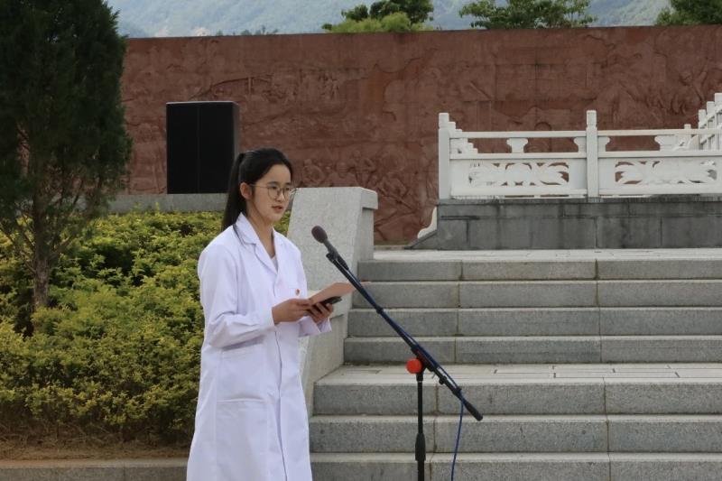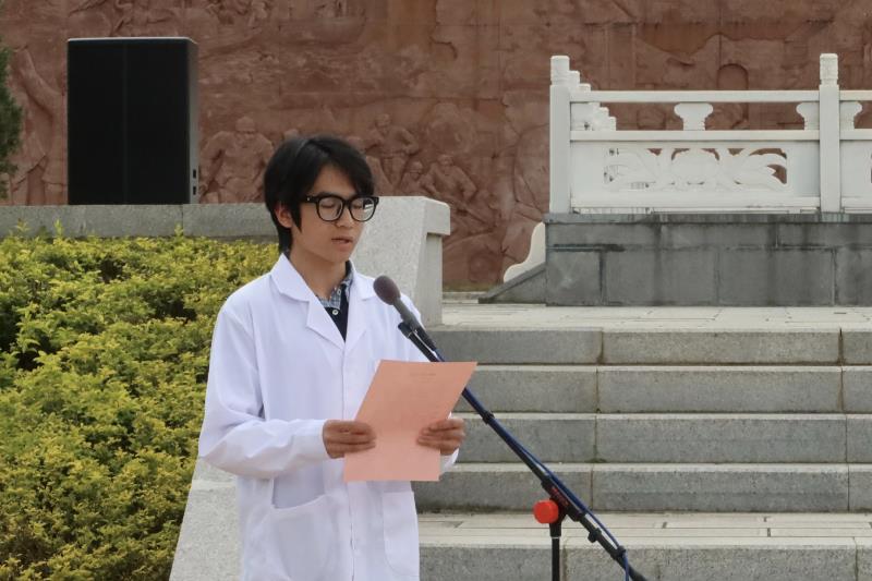 默哀毕,护理2402班韩娟同学带领全体团员青年高举右拳、庄严宣誓,重温入团誓词。铿锵有力的誓言在陵园上空回荡,彰显着新时代青年学子坚定的理想信念和勇担时代重任的决心。护理2501班曹倍晨同学作为学生代表发言,她结合自身学习与护理专业成长实际,诉说对革命先烈的追思与敬仰,号召全体同学以英烈为榜样,将缅怀之情化为奋进之力,立志勤学、精研专业,以过硬本领报效祖国、服务人民。