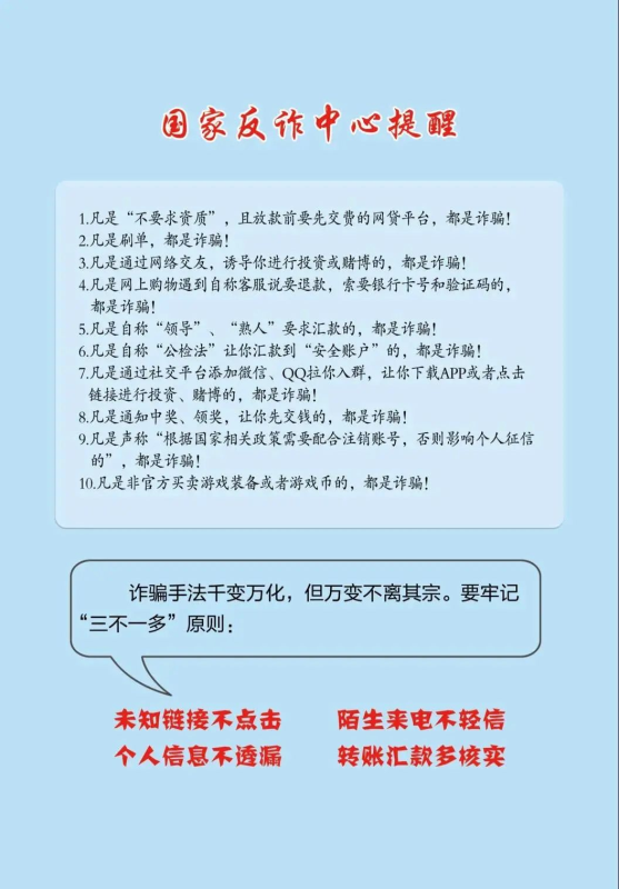 编者按:4月初,习近平总书记对打击治理电信网络诈骗犯罪工作作出重要指示,强调坚持以人民为中心,全面落实打防管控措施,坚决遏制电信网络诈骗犯罪多发高发态势。近日,为贯彻习近平总书记重要指示精神,进一步扩大反诈宣传覆盖面,提高广大群众防骗意识,国家反诈中心制作了《防范电信网络诈骗宣传手册》,向广大人民群众介绍了十种常见的电信网络诈骗类型,揭批诈骗犯罪手法、解析典型案例,进行防骗提示。根据教育部、公安部相关要求,现将《防范电信网络诈骗宣传手册》分享如下,请各省学会、各高校结合本地本校情况,大力开展宣传落实,有创新经验或重要成果,请向中国高等教育学会保卫学专业委员会秘书处反馈或投稿,联系电话0731-88823008。