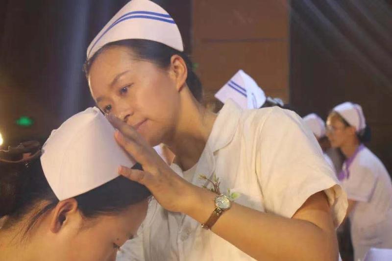 护理系郭太兵主任致辞后,护理系20级新生代表的授帽仪式开始,护理教师将圣洁的燕尾帽戴在护士生头上,所有护士生在南丁格尔像前庄严地许下了自己的誓言。教务科茶国萍科长带领学生们宣誓,向在场学生重申了南丁格尔精神的意义以及护理工作的神圣与崇高。