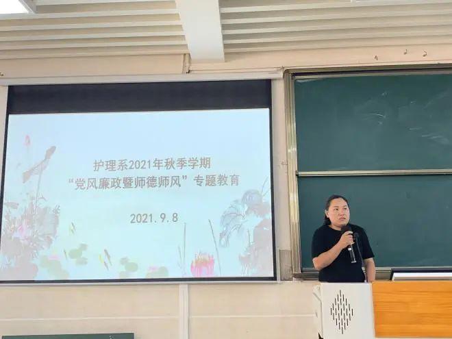 为了贯彻落实省教育工委、省教育厅下发的云教工委函〔2021〕4号文件《关于开展师德师风和校园安全专项整治的通知》文件精神。9月8日下午,护理系党支部在第三阶梯教室组织开展了2021年秋季学期“党风廉政暨师德师风”专题教育。学院陈跃祥副院长及护理系全体党员、教学人员、辅导员、班主任参加了此次主题教育专题会。