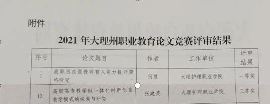 根据《教育部等十部门关于做好 2021 年职业教育活动周相关工作的通知》(教职成函[2021]5号)和省有关要求,大理州教育体育局制定了《大理州 2021 年职业教育活动周工作方案》,举办了一系列职业教育宣传活动,职业教育论文竞赛是其中一项活动内容。近期,州教体局公布了2021年职业教育论文竞赛结果的通知,bat365推荐的2篇论文在本次评比活动中获奖。