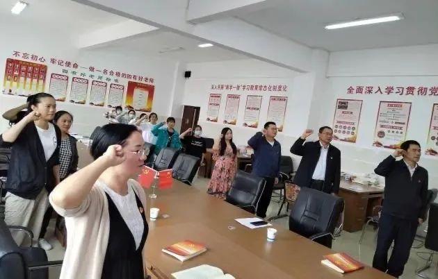 全体党员在党旗下高举右手,重温入党誓词,神圣庄严,目光坚定,铭记党员身份,坚定理想信念,不忘初心听党话,坚定不移跟党走。
