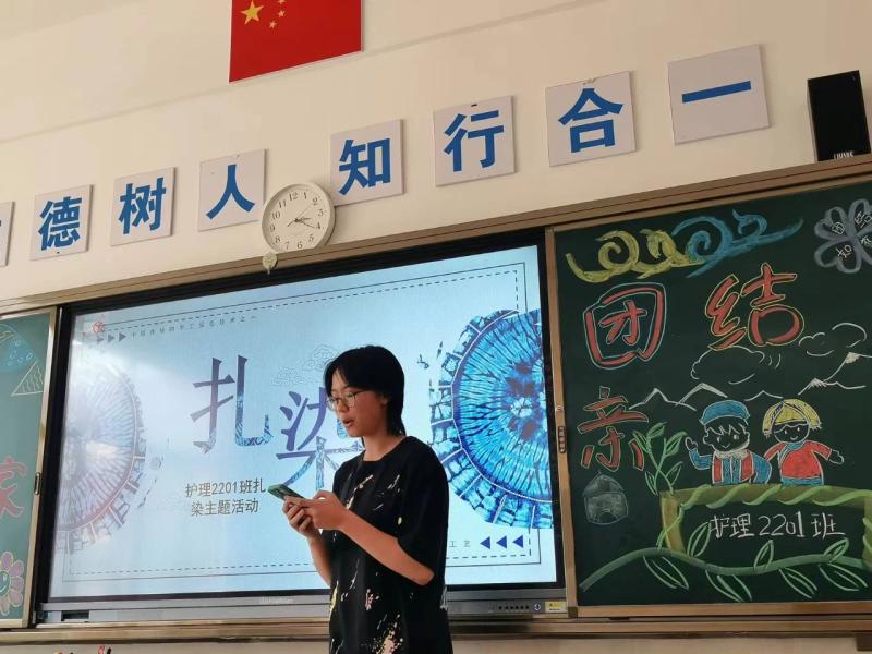 护理2201班团支部组织委员高子捷同学带领大家学习了白族扎染艺术的发展历史,班长许思娜同学耐心细致地讲解了白族扎染艺术的方法步骤。