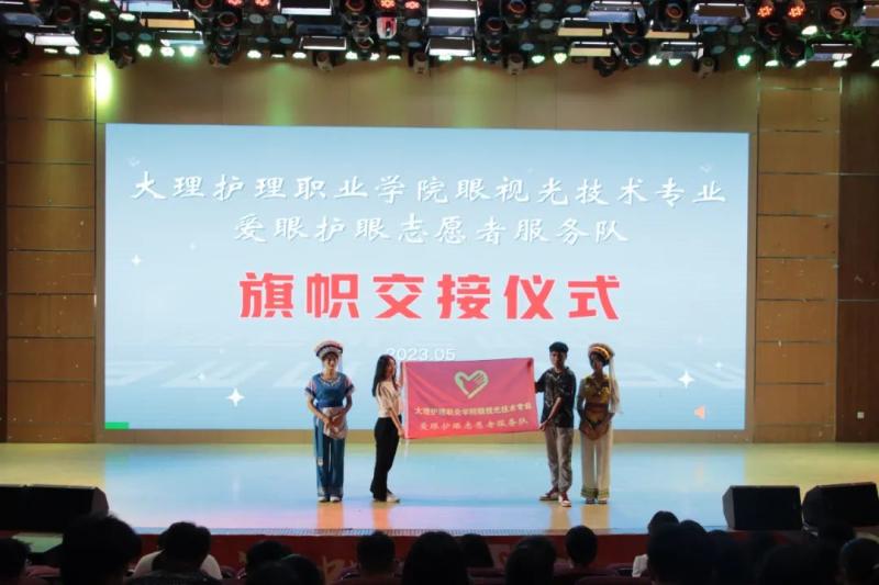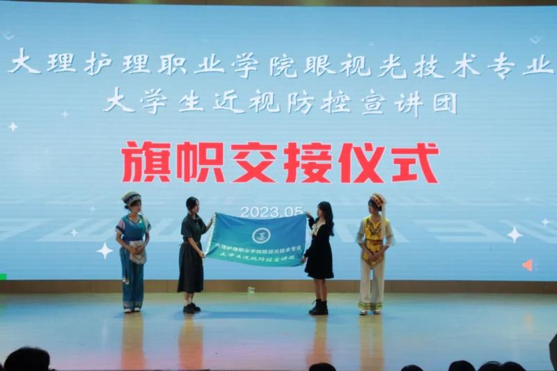 比赛现场还举行了由即将离校实习的学生原负责人向在校学习的学生新负责人交接“bat365中文官方网站眼视光技术专业大学生近视防控宣讲团”“bat365中文官方网站眼视光技术专业爱眼护眼志愿者服务队”的旗帜交接仪式。接过的不只是队旗,也是眼视光精神的传承!更是作为眼视光技术专业学生,对近视防控事业的责任和承诺!