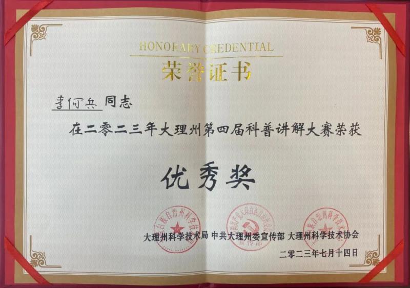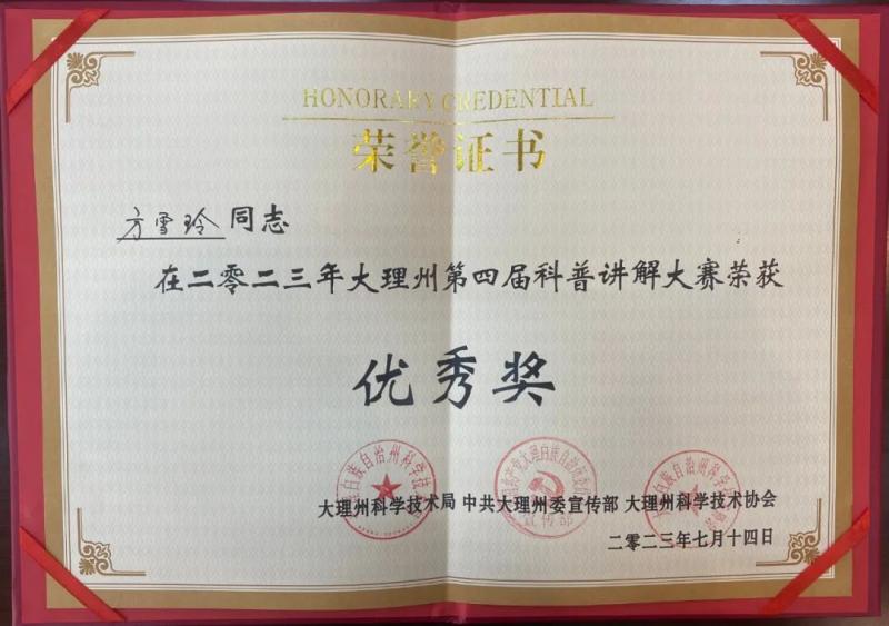 7月14日,bat365中文官方网站学生方雪玲、李何兵在大理州第四届科普讲解大赛中荣获优秀奖。