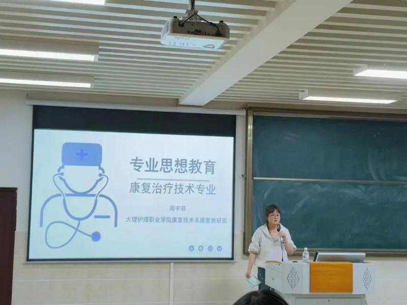 康复教研室主任周宇菲老师就康复治疗技术专业的培养目标、职业资格证的获取及毕业去向三个方面,向2023级康复治疗技术专业的新生做了详细讲解。同时,勉励同学们尽快适应新的学习生活,不断充实、提升自我!