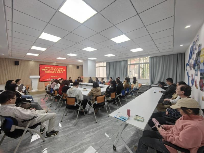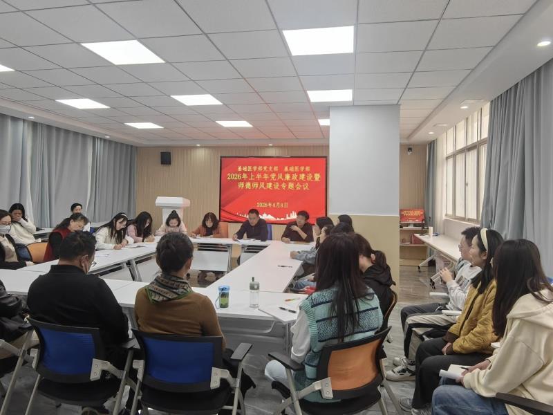 4月8日,bat365中文官方网站基础医学部召开2026年上半年党风廉政建设暨师德师风建设专题会议,旨在进一步严明纪律规矩、强化底线思维,推动清廉学校建设走向纵深。校党委委员张磊到会指导,党支部书记段益顺主持会议。基础医学部全体教师参加会议。