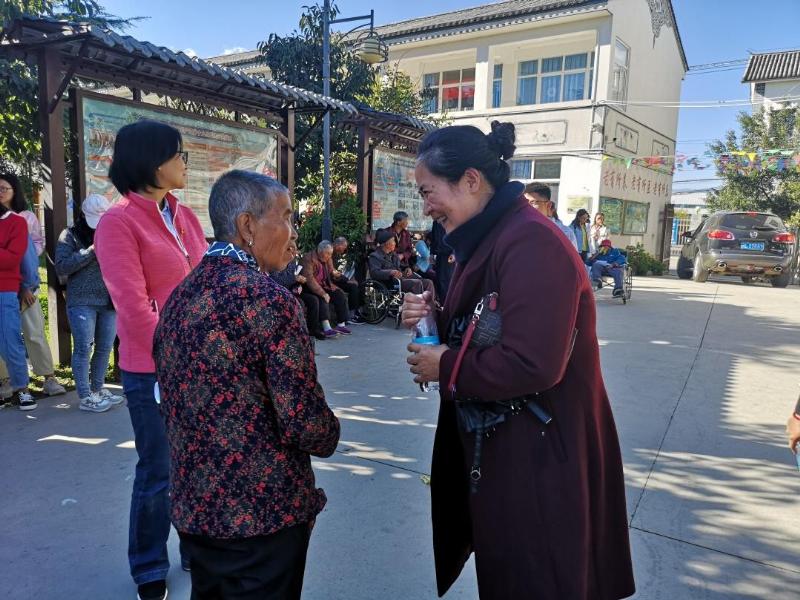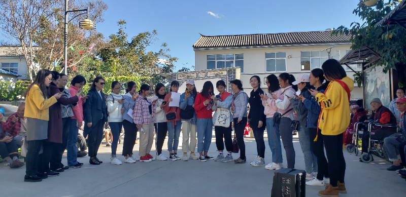 老师们与老人进行交流,问候身体情况,并遇上大理卫校的退休职工刘代亮同志(83岁),刘老师仍记得部分老教师,说起往事,倍感亲切。老师们为老人演唱了《没有共产党,就没有新中国》,老人们拍手叫好,气氛热烈。
