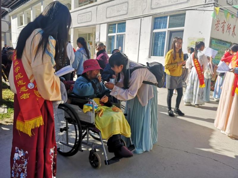 学生们热情洋溢,为养老院打扫卫生,为老人进行按摩理疗,帮助老人们从屋内来院子里晒太阳,给老人们喂水果吃,献上丰富的节目表演。同学们为老人们朗诵了《乌骓别霸王》、《墨萱图》等诗歌,演唱了《和你一样》歌曲,并进行茶道表演,书法创作等丰富的节目,老人们喜笑颜开。