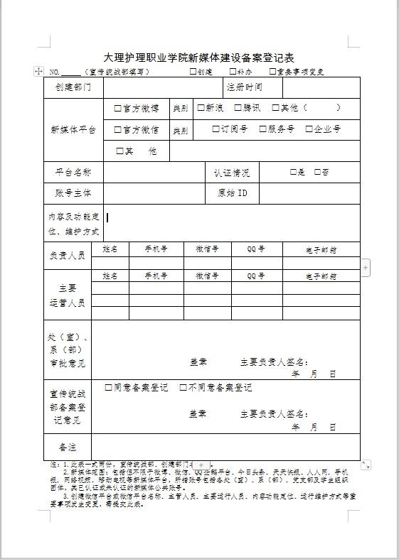 第六条 申办单位须在平台开通前5个工作日内提交申请,填报《bat365中文官方网站新媒体建设备案登记表》。