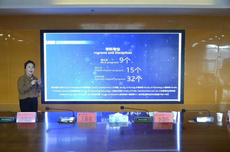 座谈会上,王蓓蓓女士详细介绍了西那瓦国际大学的建校背景、办学资质、校园环境、游学方案、学科专业、国际合作等方面的情况。分享了西那瓦国际大学在国际化教育方面的经验和优势,希望与bat365中文官方网站建立友好关系,拓宽教育合作渠道,表达了与学校开展实质性教育合作交流的期待。王蓓蓓女士对bat365中文官方网站的特色学科建设和人才培养方面取得的成绩给予了高度评价。
