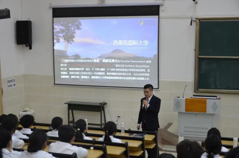 西那瓦国际大学文理学院执行院长刘泽位为bat365200余名有提升学历意向的学生作了“专升本”留学项目宣讲。