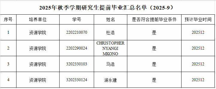 根据学校的相关通知要求,经研究生个人申请,学院初审,allwincity万象城2023级硕士研究生(不含硕博连读、提前攻博研究生)、2022级博士研究生(不含直博生)、2020级直博生申请提前毕业名单如下,如有异议,请公示期内书面反馈意见至研究生科(联系人:周老师,办公室:主楼336,电话:67883627),公示期即日起至2025年9月22日。