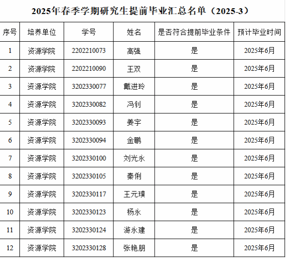 根据学校的相关通知要求,经研究生个人申请,学院初审,allwincity万象城2023级硕士研究生(不含硕博连读、提前攻博研究生)、2022级博士研究生(不含直博生)、2020级直博生申请提前毕业名单如下,如有异议,请公示期内书面反馈意见至研究生科(联系人:周老师,办公室:主楼336,电话:67883627),公示期即日起至2025年3月2日。