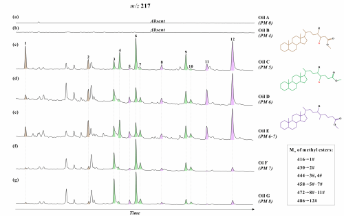allwincity万象城朱钢添副教授团队选取南襄盆地泌阳凹陷原油作为研究对象,通过气相色谱-质谱(GC-MS)、全二维气相色谱-飞行时间质谱(GC×GC/ToF-MS),系统分析了一系列母源关系接近但生物降解等级不同的原油样品中的甾烷酸分布。GC-MS分析结果表明,在未降解和低降解等级的原油样品中,未检出甾烷酸信号,只有在生物等级较高(规则甾烷开始发生明显降解)的原油样品中才能检测到甾烷酸,说明该类酸性生物标志物是甾烷的生物降解产物(图1)。