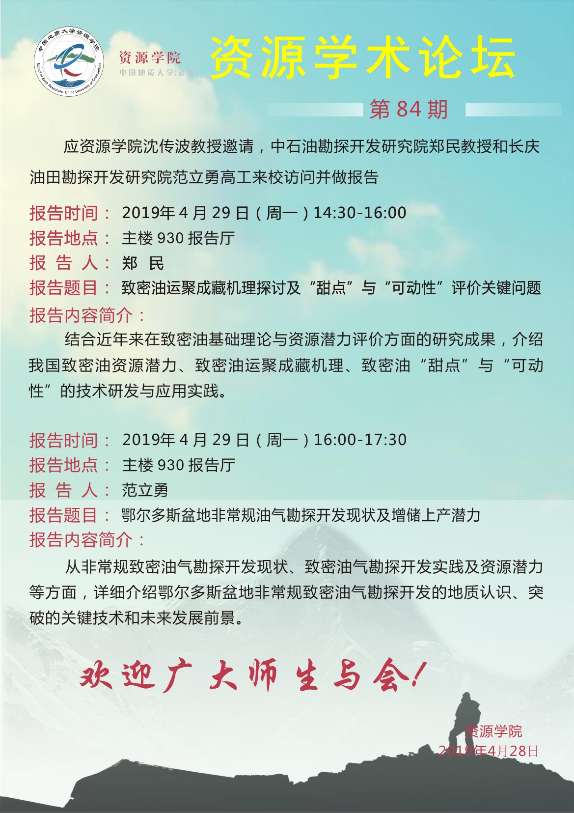【4月29日】第84期资源学术论坛:郑民、范立勇学术报告