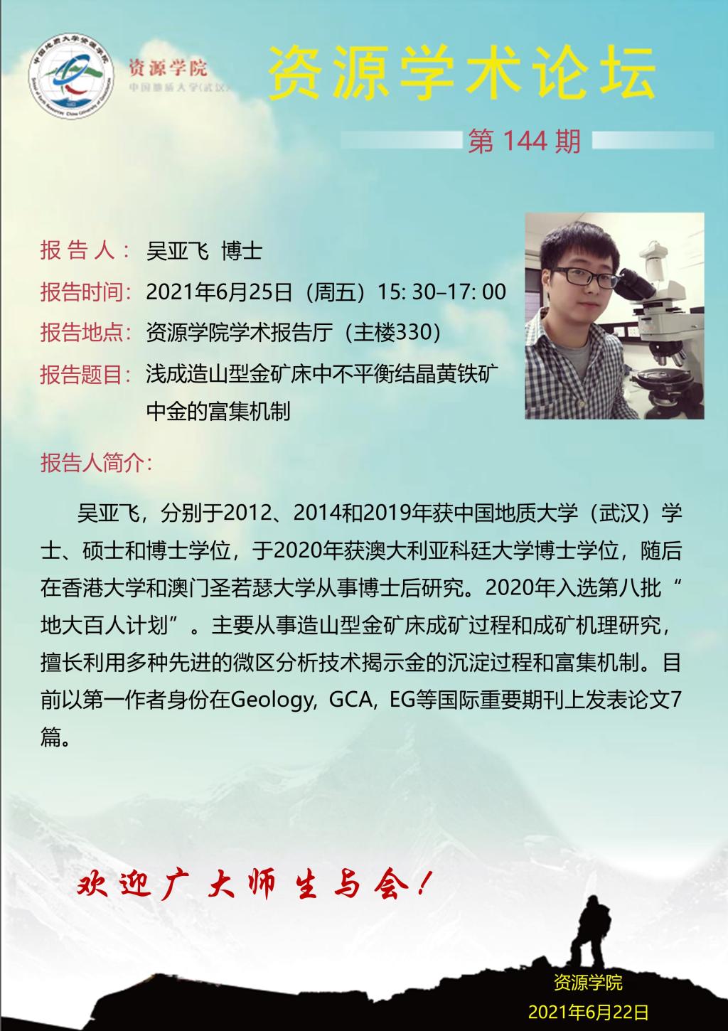 【06月25日】第144期资源学术论坛:吴亚飞学术报告