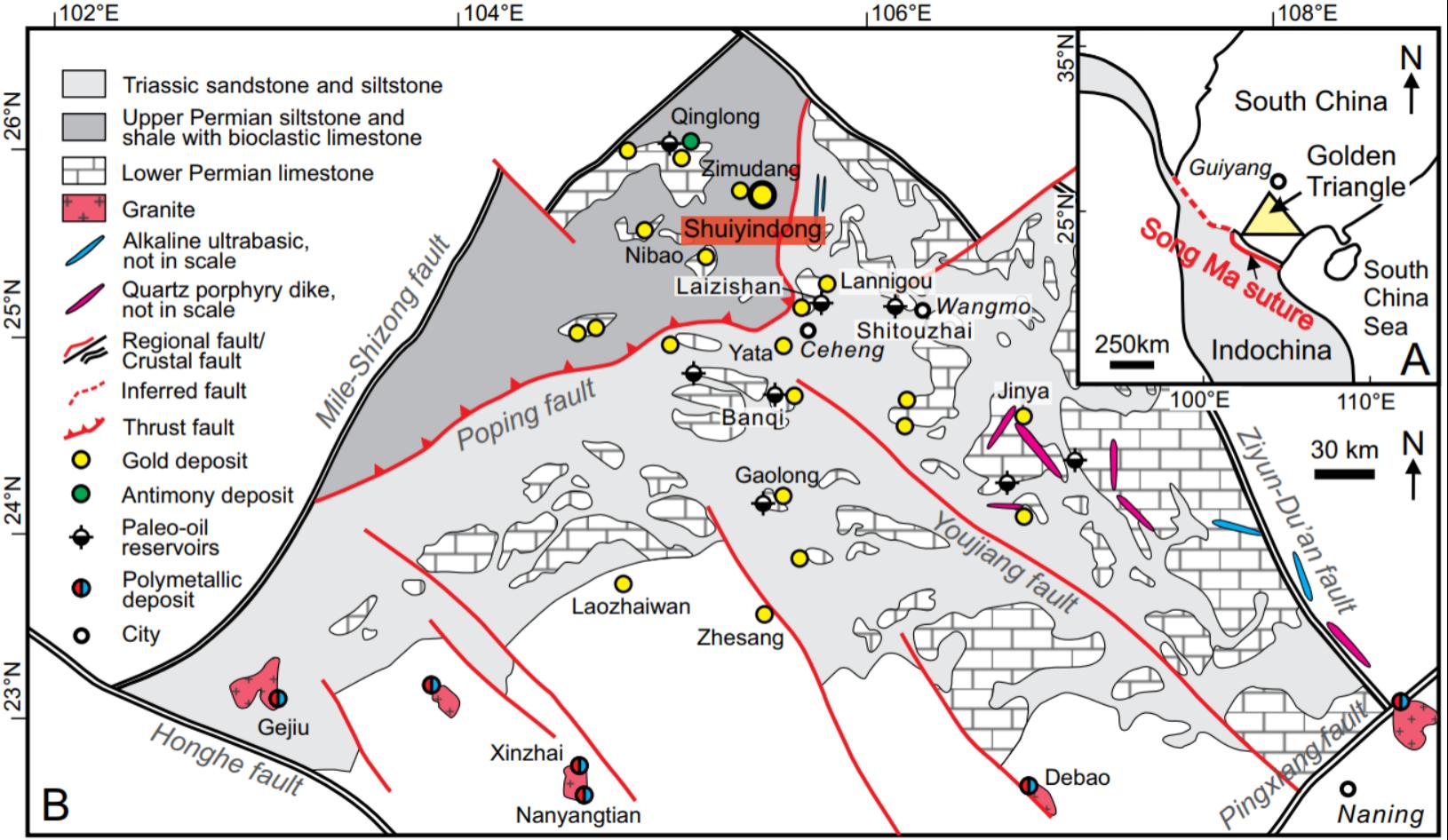 我国西南右江盆地中发育了大量赋存于沉积岩中的金矿床(图1),其矿化地质特征与卡林型金矿床具有诸多相似之处,被认为是目前除了美国内华达地区以外世界上最大的卡林型金矿矿集区。近期,万象城体育awcsport(武汉)李建威教授团队的靳晓野助理研究员利用稀有气体同位素和LA-(MC)-ICP-MS方解石U-Pb测年法分别对该地区的典型金矿床开展了矿床地球化学示踪和成矿年代学研究,旨在为区域及其他地区卡林型金矿床的矿床成因研究提供新的思路或借鉴。