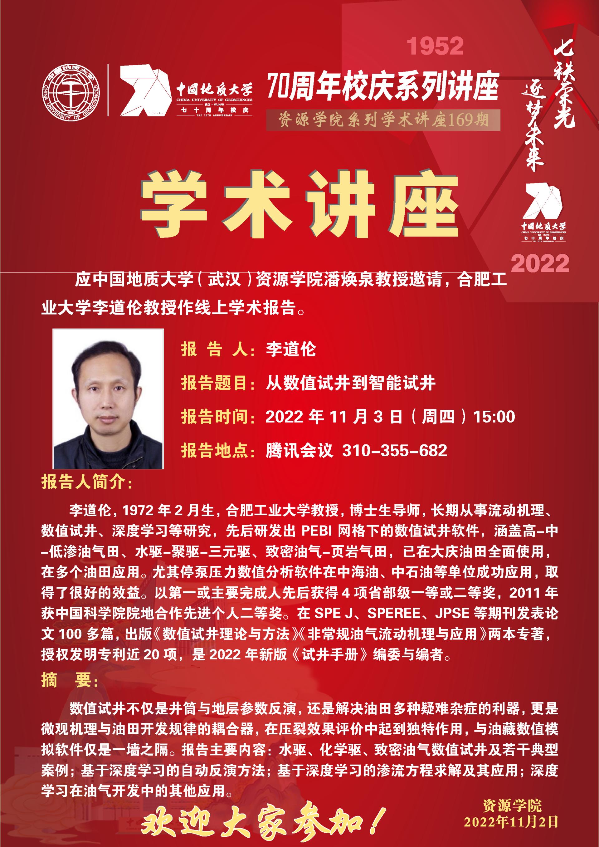 【11月3日】第169期资源学术论坛:李道伦学术报告