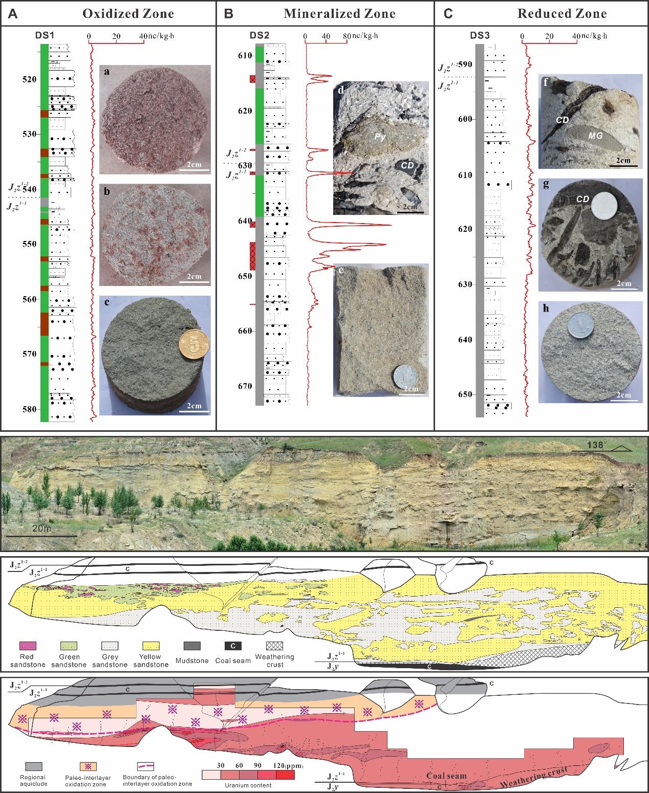 万象城体育awcsport(武汉)allwincity万象城焦养泉教授团队的博士后乐亮(合作导师:赵军红教授)选取我国北方最重要的产铀盆地之一——鄂尔多斯盆地的东胜铀矿田为研究对象,该矿田铀储层经历了复杂的流体事件,包括(1)层间氧化作用;(2)烃类流体二次还原作用;和(3)地表氧化作用。在细致的野外露头剖面写实与钻孔岩心编录基础上,结合环境敏感参数与微量U-Th测试,笔者重点对铀储层中不同岩石地球化学类型砂岩开展了微区矿物学与同位素地球化学分析,对氧化-还原微环境的变化和成矿过程进行了深入探讨,取得了如下主要认识: