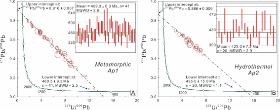 图2双旗山矿床变质(A)与热液磷灰石(B)的U-Pb年龄图解