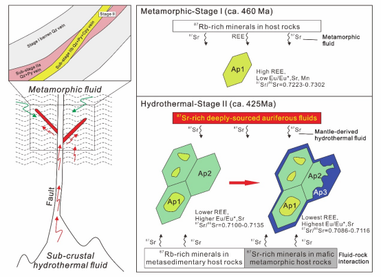 (1)根据阴极发光和微量元素特征,双旗山矿床变质和热液含金石英脉中发育三种类型的磷灰石(图1):Ap1形成于成矿前变质阶段,Ap2和Ap3在热液成矿阶段形成。Ap1富集中稀土,具有显著的负Eu异常,表明其是从Eu2+占主导地位的相对还原的变质流体中直接沉淀形成(图1);与金和含金硫化物紧密共生的Ap2和Ap3具有正Eu异常,显著区别于变质磷灰石(图1)。