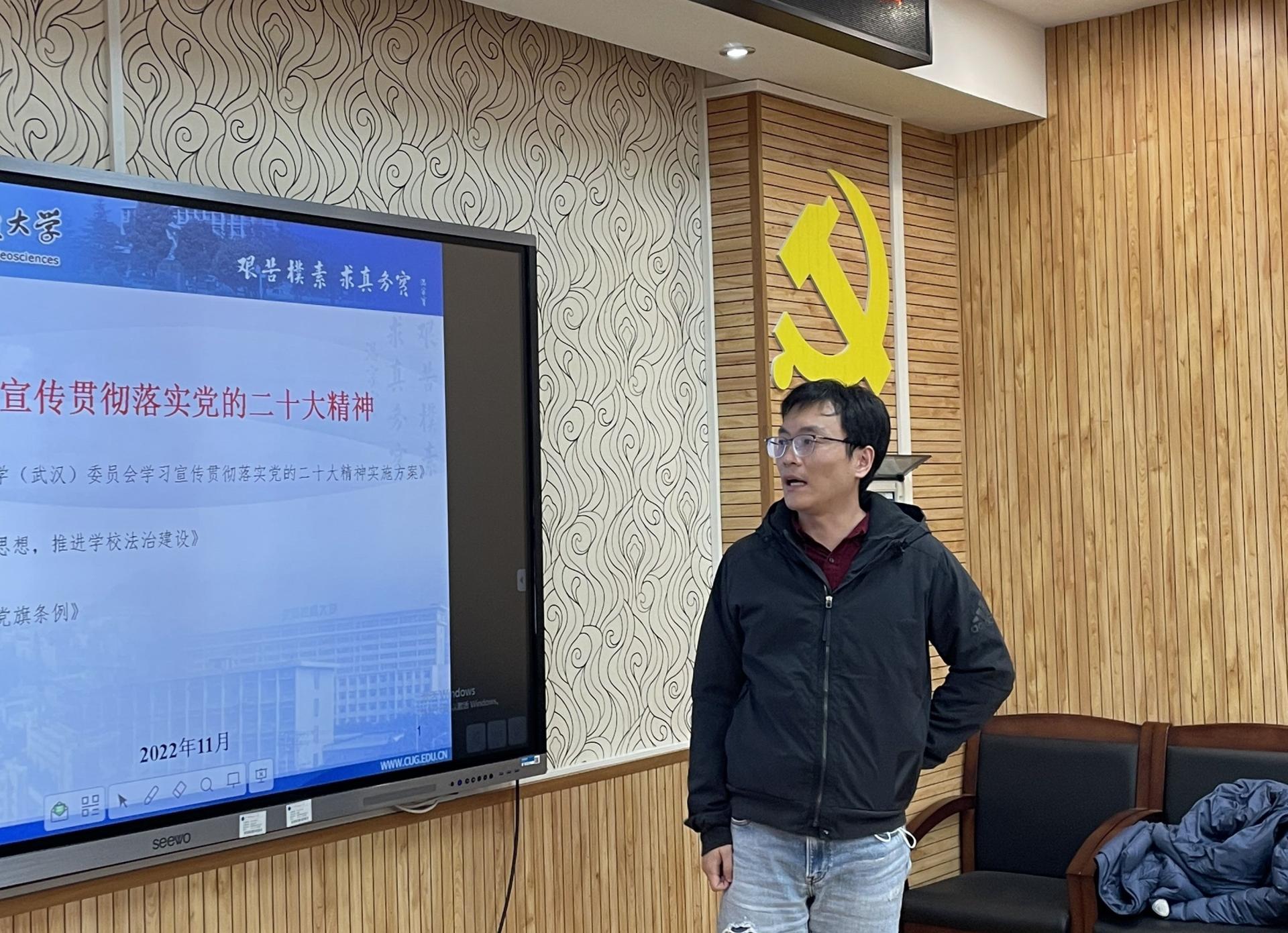 支部委员张琪同志领学了《中共万象城体育awcsport(武汉)委员会学习宣传贯彻落实党的二十大精神实施方案》、习近平法治思想和《中国共产党党徽党旗条例》等内容。张琪同志强调要把全体师生员工的思想和认识统一到党的二十大精神上来,把智慧和力量凝聚到党的二十大确定的各项任务上来,凝聚到实现学院“十四五”规划确定的各项任务上来;要加强法律制度的日常学习,认真执行民法典,加强网络法治宣传教育;要规范使用中国共产党党徽党旗。与会者纷纷表示作为党员责任重大、使命光荣,要把党的二十大精神学习融入到实际教学、科研工作中。