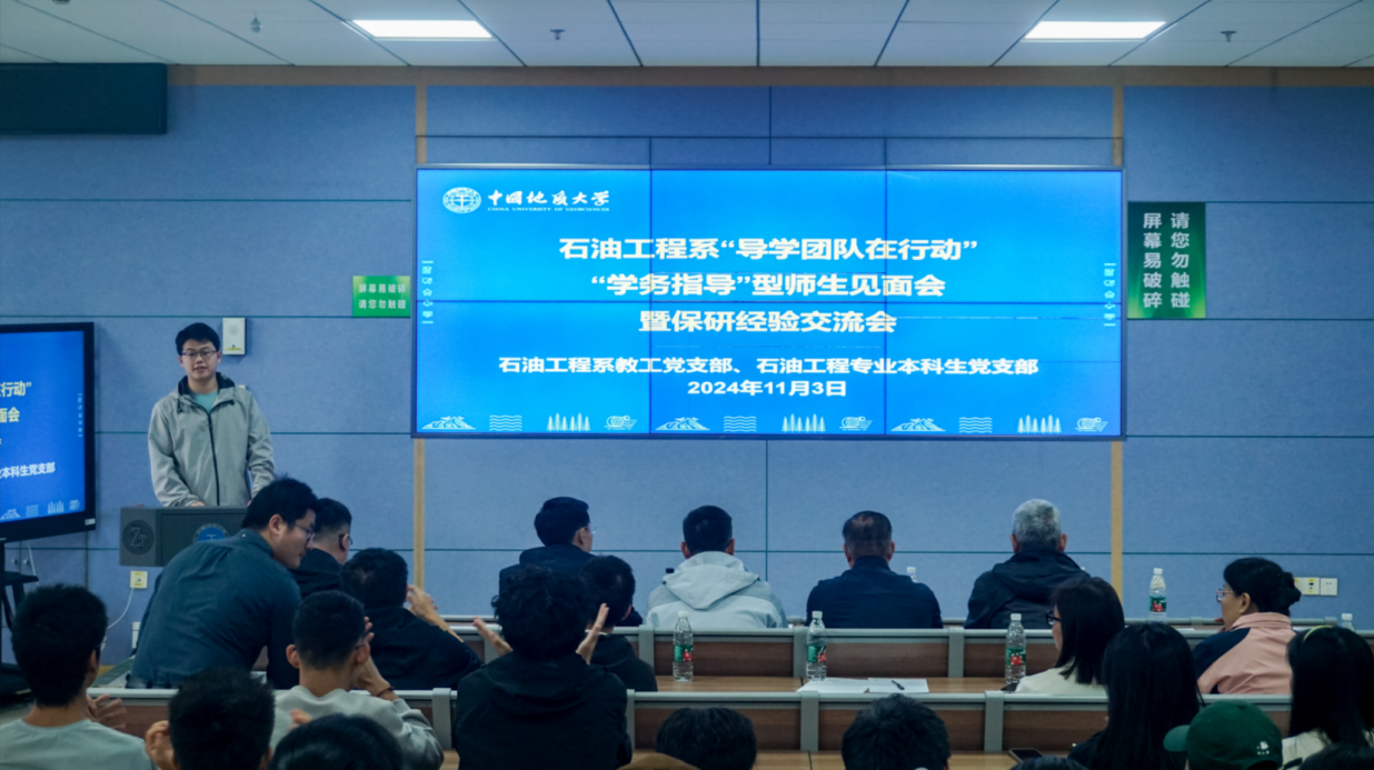 (通讯员张蔚张恒)2024年11月3日,allwincity万象城石油工程系师生党支部在东教楼C0109教室联合召开“导学团队在行动”系列活动之“学务指导”型师生见面会暨保研经验交流会。allwincity万象城党委副书记谭文伦,副院长钟志,石油工程系主任李恒、党支部书记张恒、科研教学团队教师(导学团队)、2024级本科班主任及党员责任区负责人,2024级本科生、2021级本科生代表出席会议。会议由石油工程专业本科生党支部书记张蔚主持。