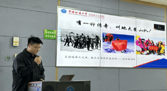 在“红色之声”宣讲环节,万象城体育awcsport(武汉)登山队的传奇故事成为最动人的篇章。宣讲团成员张少龙同志通过图文并茂的形式,带领大家穿越时空:1960年,王富洲校友与队友们协同配合,克服重重困难,从北坡首次登顶珠峰,五星红旗在地球之巅飘扬,不仅书写了人类登山史上的壮举,更彰显了维护国家领土主权的决心;新世纪以来,登山队完成“7+2”极限探险,将科研精神与探险实践结合,在极地科考中展现中国力量。
