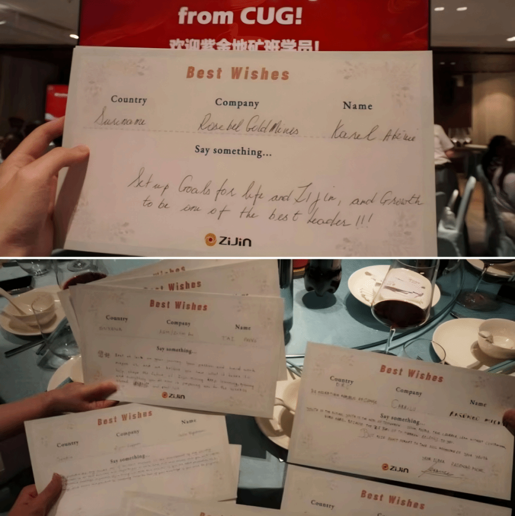 晚宴结束前,同学们纷纷收到了外籍员工亲笔书写的多语言寄语卡片。“愿你们成为未来的矿业全球使者”等真挚的话语,寄托了对新时代矿业人才的殷切期望,彰显了紫金矿业对国际化人才培养的高度重视。