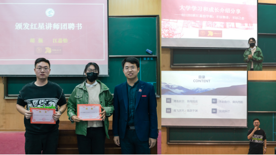 随后,第十期红星朋辈榜样论坛开讲。第十四期“李四光”计划学员、021194班班长胡强以《海阔凭鱼跃 天高任鸟飞》为题系统介绍了大学保研政策、学院推免情况,分享了大学成长经历,并围绕学习方法、科研启动、考研准备、课外生活与同学们进行了探讨。国家奖学金获得者、021203班江嘉怡以《不以物喜 不以己悲》为题,介绍了在大学学习中如何寻找动态平衡、消解焦虑情绪和学习的方法技巧;她讲到,在大学,选择干一件让自己感觉到快乐的事并持久坚持,会很幸福,专业学习就是最好的选择。霍少孟为胡强、江嘉怡颁发allwincity万象城“红星讲师团”聘书。