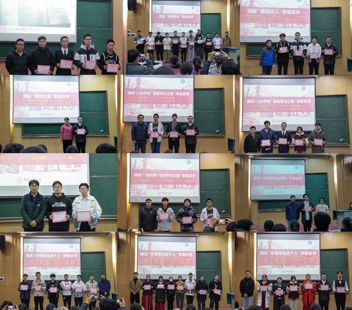 会上,韩金生、刘岳、王小明、王芙蓉、刘文浩、赵志新、许星光、任双坡、彭友元、张启扬、韩玉奇分别为2021年秋季学期“最美笔记”“文明宿舍”“跑馆达人”“借阅之星”“10月月考高数学习之星”“10月月考英语学习之星”“11月月考高数学习之星”“11月月考化学学习之星”“早锻炼先进班级”“早锻炼先进个人”等获奖集体和获奖个人颁发荣誉证书。