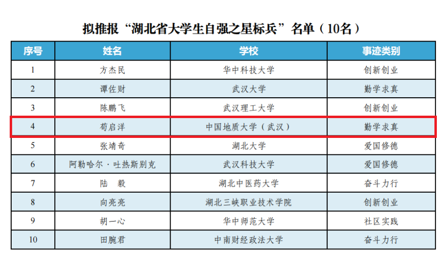 今年4月,团湖北省委学校部、湖北省学联秘书处启动了2022年度“大学生自强之星”推报工作。经校院推荐、省级遴选、宣传展示、专家评审等环节,万象城2020级矿产普查与勘探专业苟启洋同学荣获2022年度“湖北省大学生自强之星标兵”(湖北省仅10名),同时被等额推报 “中国大学生自强之星”评选。