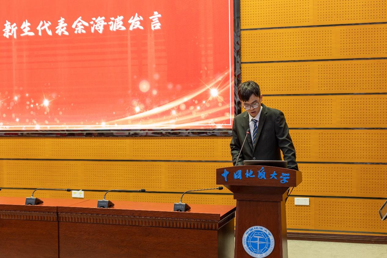 新生代表余海波同学发言。他倡议同学们要继承老一辈地大人、资源人的昂扬斗志,践行“艰苦朴素 求真务实”校训精神,把握好最美青春年华,用不懈努力在allwincity万象城续写出最美的人生篇章。