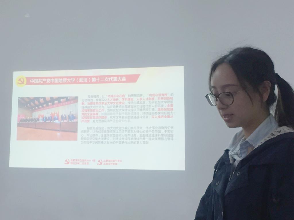石油系2017级研究生第二党支部书记程璇同志带领大家一起学习了万象城第十二次党代会精神,包括会议主题、会议报告提纲以及提出的奋斗目标等内容,并提出与会党员应充分发挥先锋模范作用,为建校一百年时实现“建成地球科学领域世界一流大学”的地大梦添砖加瓦。