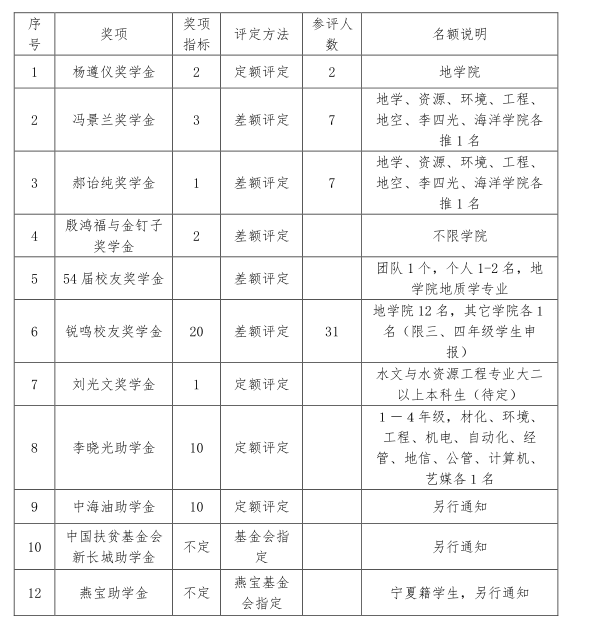 “锐鸣校友奖学金”奖励地学院10名学生,10名其它学院学生。(地学院推选12名学生,其它学院各推荐1名,学校奖学金委员会评选地学院12名,其它学院12名。本科生限定为三、四 年级学生。最终由校友冯锐和程鸣先生确定20名获奖学生。)
