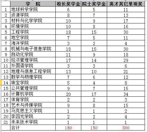 “地大英才奖学金”(“李四光英才奖”、“少数民族学生奖”、“创业之星奖”除外)采取等额评选办法,各学院具体名额见下表。