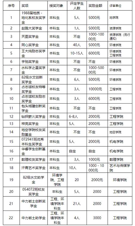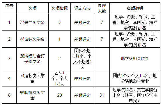 “锐鸣校友奖学金”奖励地学院10名学生,10名其它学院学生。(地学院推选12名学生,其它学院各推荐1名,学校奖学金委员会评选地学院12名,其它学院12名。本科生限定为三、四年级学生。最终由校友冯锐和程鸣先生确定20名获奖学生。)