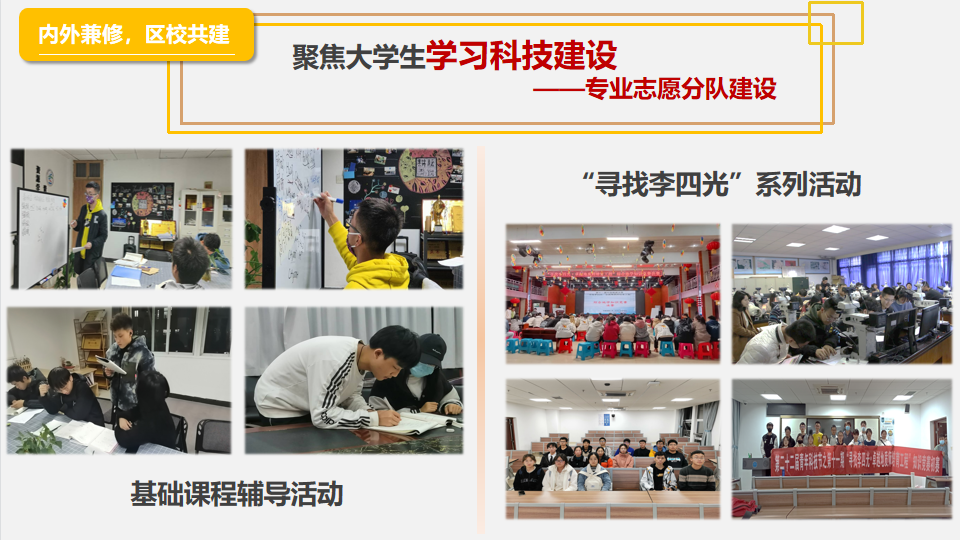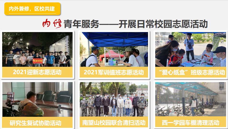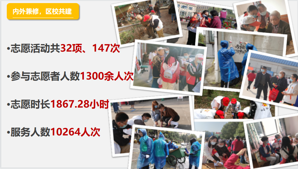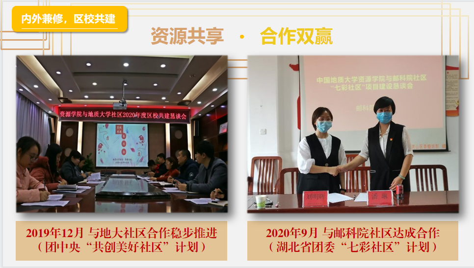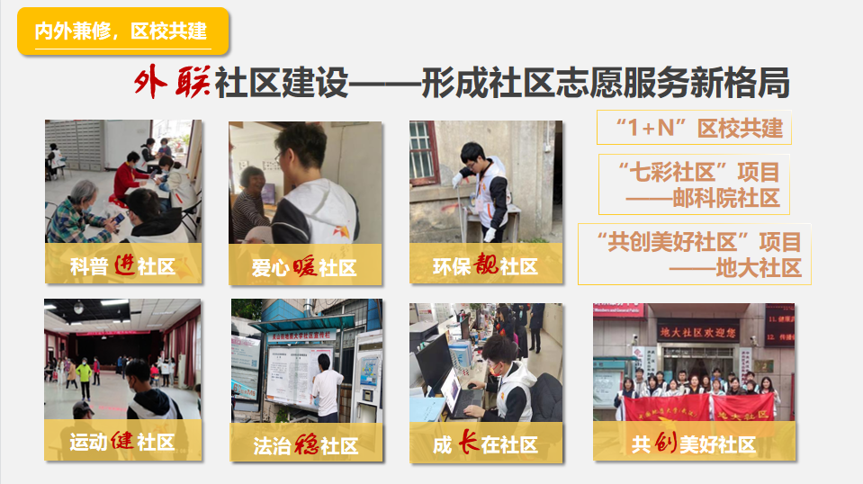 协会自2015年启动区校共建志愿服务项目,积极探索区校协同共建志愿服务社会实践育人基地模式,已在地大社区、邮科院社区开展科普进社区、文化暖社区、环保靓社区、运动健社区、法治稳社区、成长在社区、共创美好社区“一进一暖一靓一健一稳一长一创”全方位志愿服务格局,年均开展活动过百次,参与志愿者累计3000余人次,服务人数超20000人。2018年建设的大学生挂职社区书记助理项目被洪山区组织部在全区推广,获评洪山区优秀党建项目。2020年8月,成功获批由团省委、省志愿者协会主办的“七彩社区”项目。2020年12月,成功获批团中央“共创美好社区”项目试点单位。