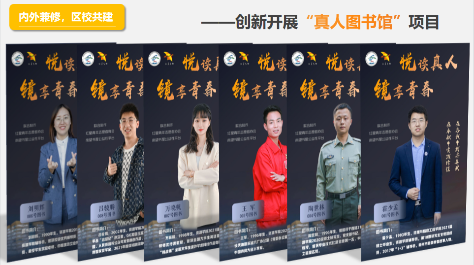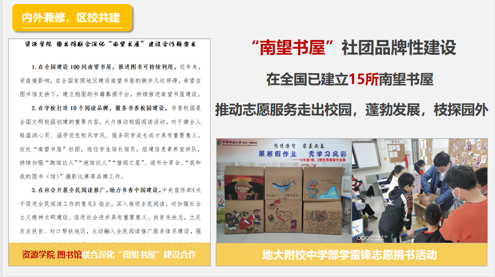 协会大力发展“南望书屋”书籍公益平台,筹集书籍20000余册,在宁夏泾源东峡小学、湖北秭归兰溪小学、湖北红安英才希望小学、甘肃卓尼扎古录九年制学校、安徽望天乡马嘶小学、武汉市第一聋校、广西百色老桑小学、山东菏泽通古小学等地共建立15所南望书屋。创新推动“真人图书”项目,赋值志愿服务时长,为同学成长解惑答疑。